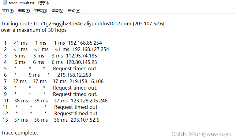 1、在cmd窗口输入以下命令 会得到trace_result.txt文本,打开txt把里面路由ip复制下来。 (如果不指定txt前面的路径,默认保存在用户目录下)