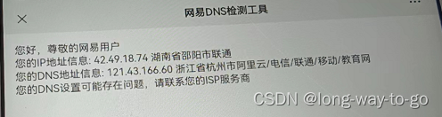 用户设备在浏览器登录网址网易DNS检测工具,显示ISP的DNS异常了,这种情况是比较好解决的,改个DNS基本就行了(在设备WiFi设置那里改DNS或者在路由器设置DNS,DNS一般改为223.5.5.5或者119.29.29.29或者114.114.114.114。)。或者联系ISP处理。