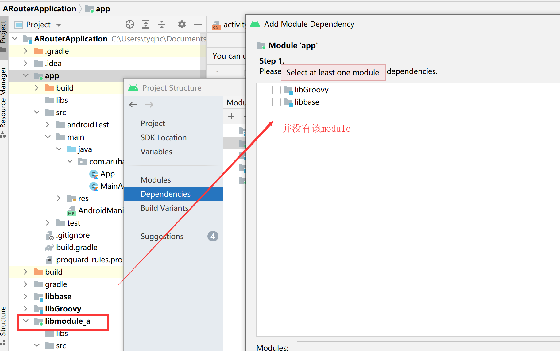 将创建项目时的默认的app module作为Application,最后完整的app还是得通过该module来编译,但此时并不能将module_a引入到app module中,找不到module_a