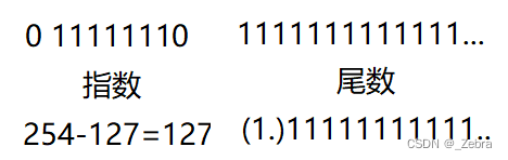 指数全1的情况(255-127)为了表示特殊的值被用掉了,所以指数最大是254-127=127,尾数省略1和小数点,所以为了使尾数最大,取全1,这时候尾数 = ,这个数非常接近2,所以最后的值就是2*2^127 = 2*1.7014 E38,大概就是3.4E38左右,