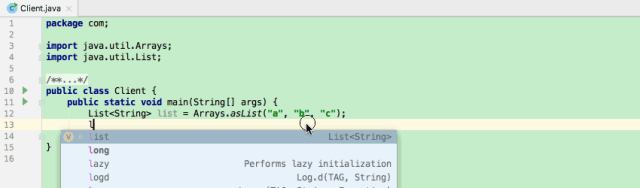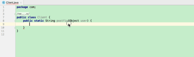 这个功能可以使用代码补全来模板式地补全语句,如遍历循环语句(for、foreach)、使用 String.format() 包裹一个字符串、使用类型转化包裹一个表达式、根据判(非)空或者其它判别语句生成 if 语句、用 instanceOf 生成分支判断语句等。
