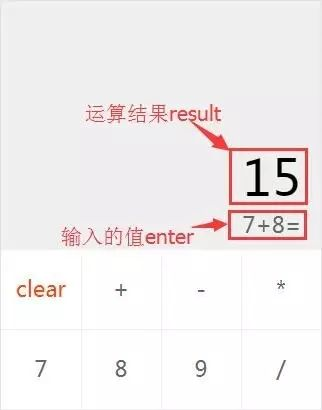 分析一:考虑到运算的结果result和所有输入的值enter(看下图指示),是跟每个组件相关联的,我们会将result和enter作为应用层的状态(全局数据)处理,这里就会简单使用到我们的Vuex提供的仓库store。