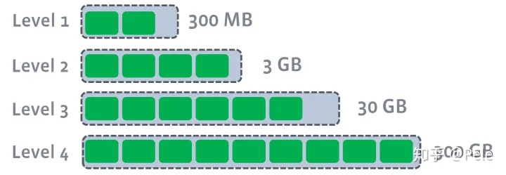 - size-tiered 策略:size-tiered策略保证每层SSTable的大小相近,同时限制每一层SSTable的数量。如上图,每层限制SSTable为N,当每层SSTable达到N后,则触发Compact操作合并这些SSTable,并将合并后的结果写入到下一层成为一个更大的sstable。由此可以看出,当层数达到一定数量时,最底层的单个SSTable的大小会变得非常大。并且size-tiered策略会导致空间放大比较严重**。**即使对于同一层的SSTable,每个key的记录是可能存在多份的,只有当该层的SSTable执行compact操作才会消除这些key的冗余记录。