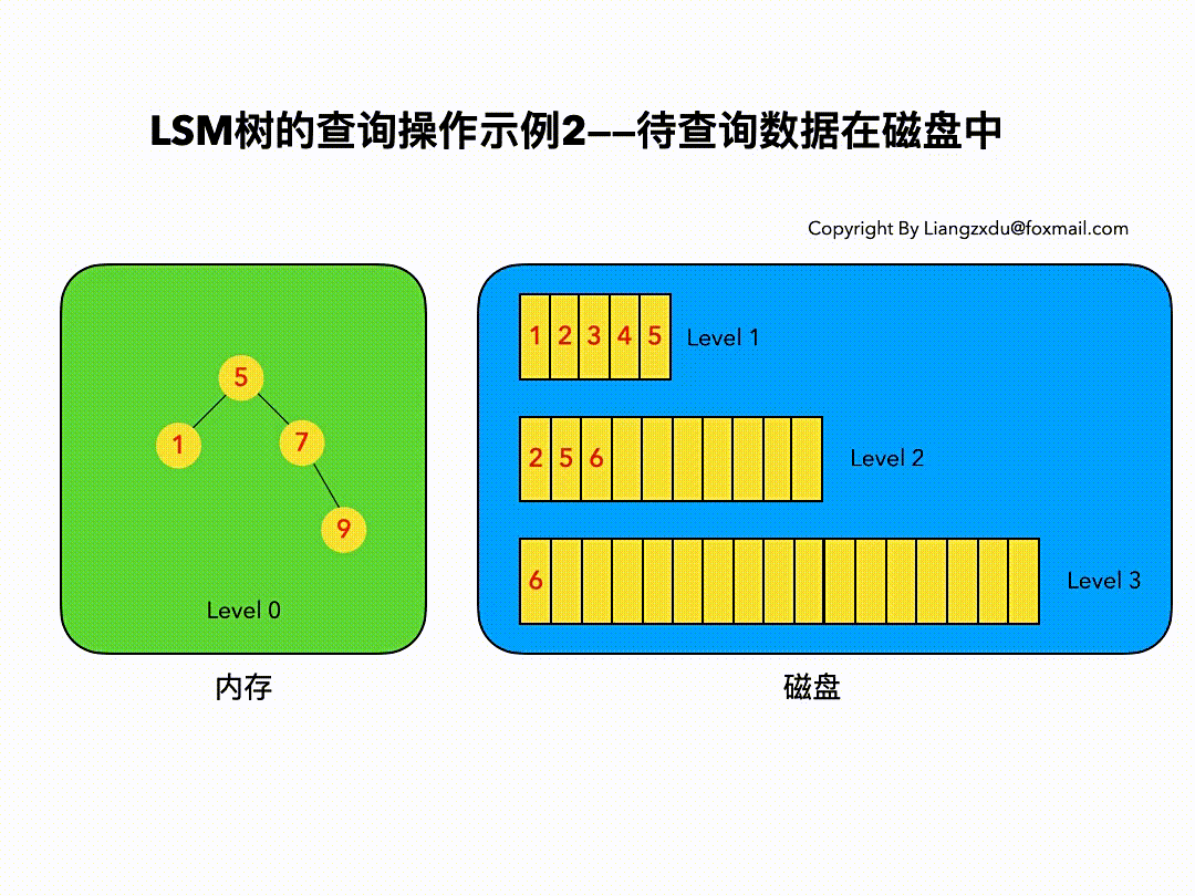如果内存树没有,查询磁盘树,以SSTable为例,先查level1的多个SSTable,没有就查level2的,一次类推,如果在level2的SSTabel都找到了key,就返回结果。
