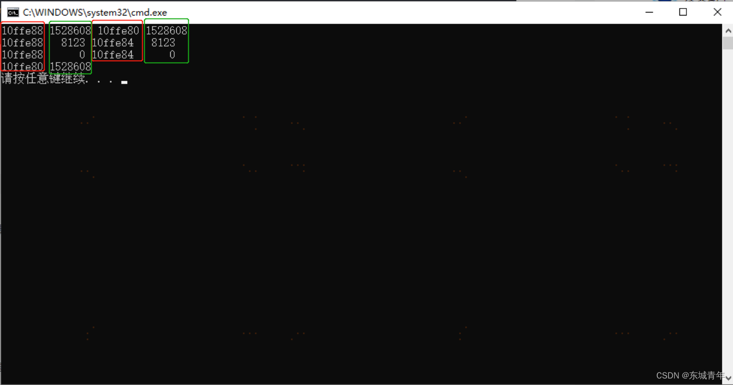 其中红色代表指针本身的地址,绿色代表指针指向的地址,int *b = a,即a和b指向同一块内存,当delete a后,a会指向8123一固定地址,只有赋NULL后才指向0地址,a指针释放后,b指针还在,程序结束后由系统自动销毁。
