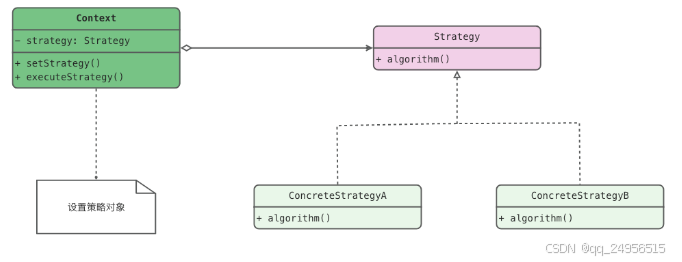 Context:上下文对象,它包含一个私有属性strategy,用于保存当前的策略对象。Context类中还包含了两个公共方法,setStrategy()方法用于设置策略对象,executeStrategy()方法用于执行策略算法。 -