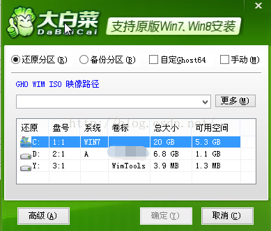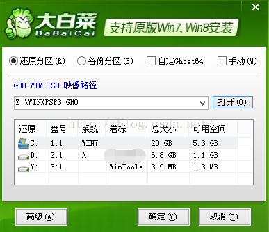 上面说到非原版的是Ghost文件,以GHO为扩展名(这里有个误区有些人会觉得只有GHO的文件才是GHOST文件,其实不然,有些人将GHO文件打包在了ISO文件里,但是程序还是可以识别的,我用做实验的就是这种情况,请大家活学活用)。我们打开桌面上的大白菜一键装机(我们这里是用的大白菜是大白菜一键装机,有些pe进去后不是叫这个名字,比如:Ghost备份和还原等等,下面有些地方也是一样,大家活学活用。)