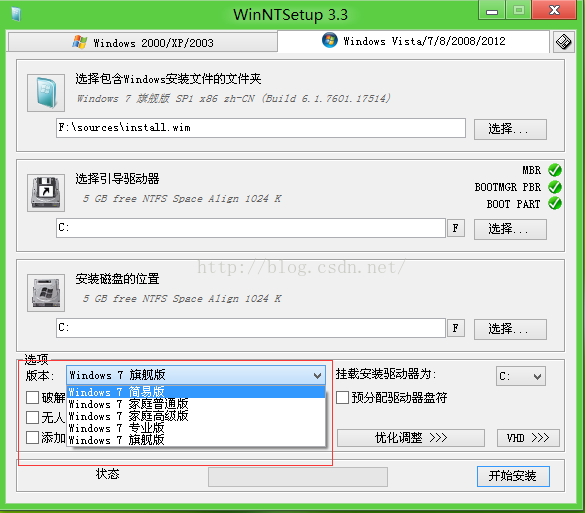 然后下一个选择,选择C盘,因为系统装在C盘,最后一个选择也选择C盘,注意下面的版本一定要选对,因为有很多可以选择的,这里选择的是旗舰版,点击开始安装。就你开始安装系统了