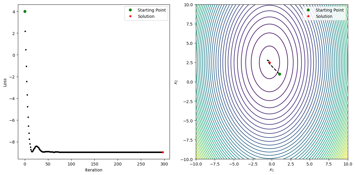 ax2.plot(xPath[-1, 0, 0], xPath[-1, 1, 0], "r*", label="Solution")
