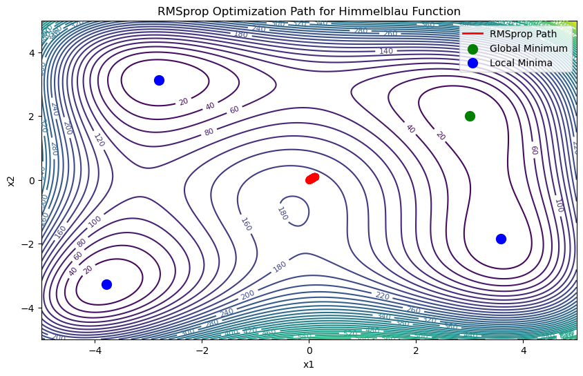 plt.title("RMSprop Optimization Path for Himmelblau Function")