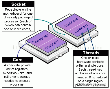 对于socket,core和thread会有不少文章介绍,这里简单说一下,具体参见下图:
