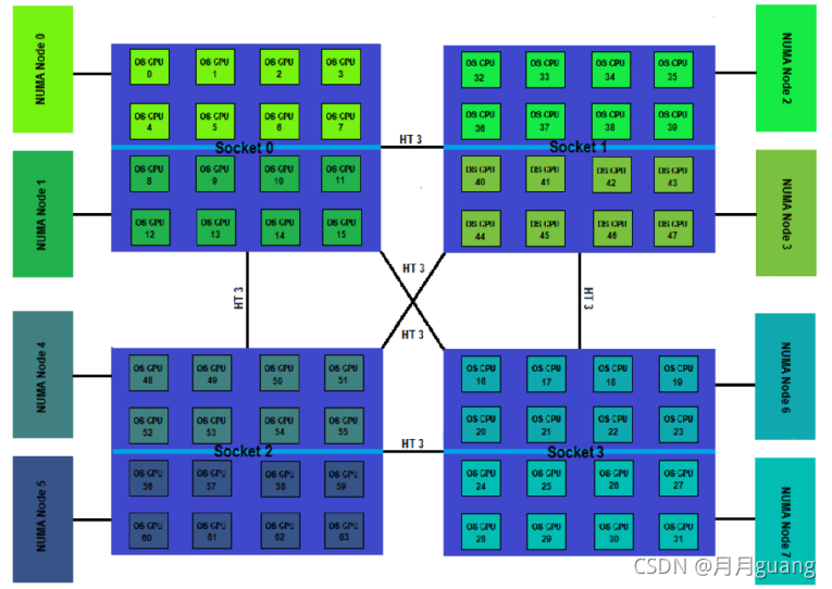 NUMA体系结构中多了Node的概念,Node其实是用来解决core分组的问题,具体参见下图来理解(图中的OS CPU可以理解thread,那么core就没有在图中画出),从图中可以看出每个Socket里有两个node,共有4个socket,每个socket 2个node,每个node中有8个thread,总共4(Socket)× 2(Node)× 8 (4core × 2 Thread) = 64个thread。另外每个node有自己的内部CPU总线和内存,同时还可以访问其他node内的内存,NUMA的最大的优势就是可以方便的增加CPU的数量,因为Node内有自己内部总线,所以增加CPU数量可以通过增加Node的数目来实现,如果单纯的增加CPU的数量,会对总线造成很大的压力,所以NUMA结构不可能支持很多的核。