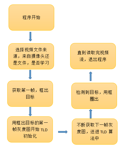 程序运行时是不断读取视频流的图片,转化为灰度图,最后交由TLD算法得出跟踪的目标,重复上述步骤。