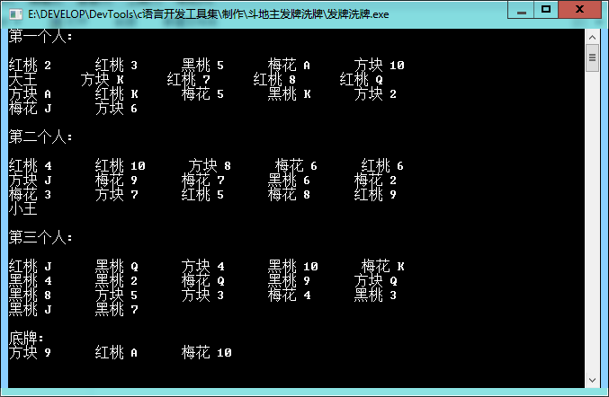 [C语言] 发牌洗牌 C语言发牌洗牌1.模拟发牌程序通过写两个函数模块来编写洗牌程序和打印的发牌程序2.编写洗牌程序void shuffle(char cards[][10],int n){ int i=54; char ca,cb,ct[10]; srand((unsigned)time(NULL)); while(i--){ ca=rand()%54; cb=rand()%54; ......