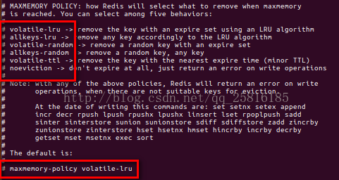maxmemory-policy noeviction:缓存过期清除策略,noeviction表示永不过期,lru最近最久未使用,random随机,ttl有限时间内,截图: