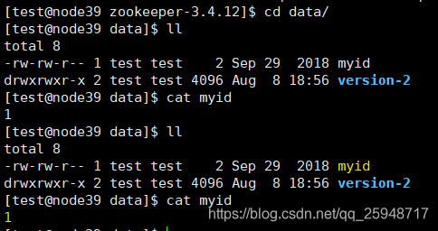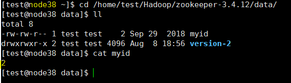 在每个节点的/home/test/Hadoop/zookeeper-3.4.12/data创建文件myid。根据zoo.cfg中