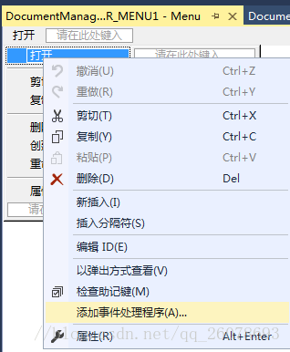 新建资源中添加一个MENU,编辑一下显示内容,选择添加事件处理可添加点击事件。