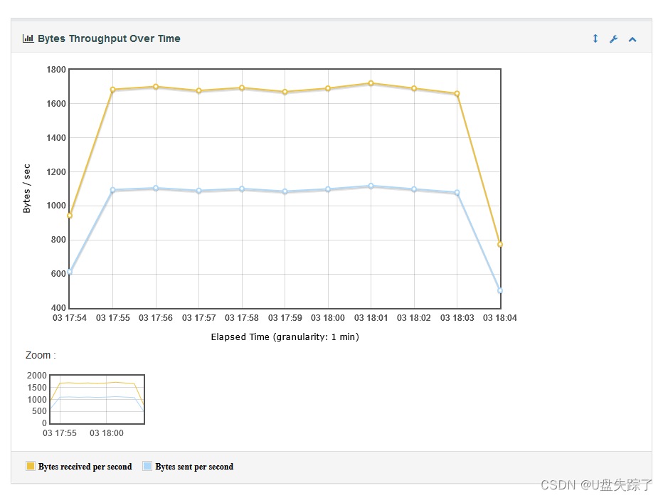 Bytes Throughput Over Time:每秒接收和请求字节数变化,蓝色表示发送,黄色表示接受