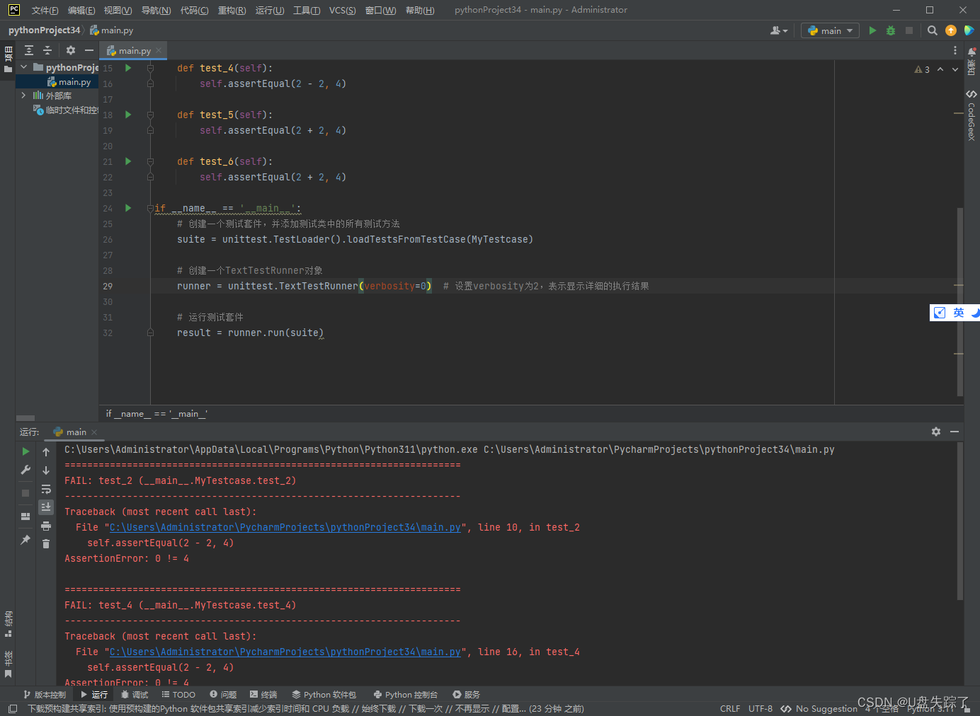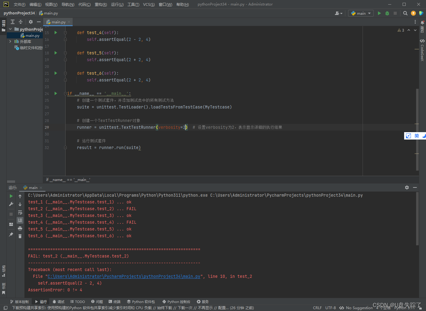 runner = unittest.TextTestRunner(verbosity=2) # 设置verbosity为2,表示显示详细的执行结果