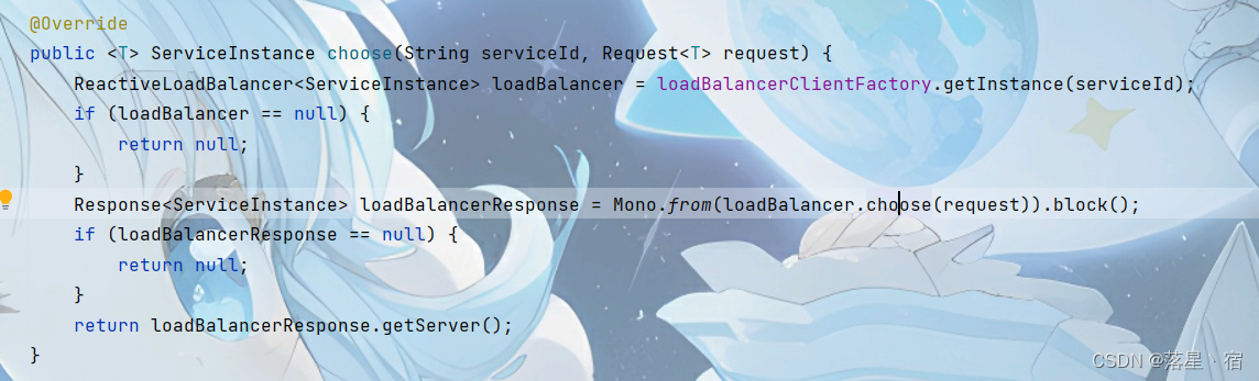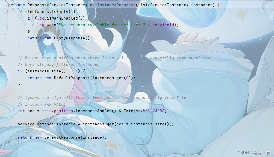而上图代码则判定服务实例列表中服务实例数量是否为1,若为1直接返回该服务实例,无需通过负载均衡算法返回(毕竟就一个,随你怎么返回也是这个来着(~ ̄▽ ̄)~)