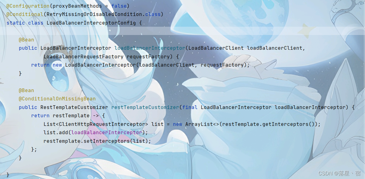 该请求会被org.springframework.cloud.client.loadbalancer下LoadBalancerAutoConfiguration中定义的LoadBalancerInterceptor拦截器拦截~