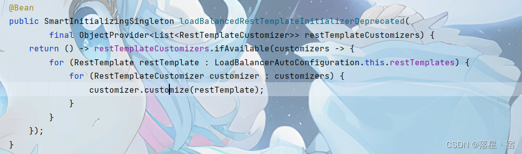根据返回类型SmartInitializingSingleton可知此方法用于Spring Bean初始化完成后立即执行一些逻辑,这个方法的大意为获取RestTemplateCustomizer对象的List集合,判断其中是否存在RestTemplateCustomizer对象,若存在则调用customizer.customize(restTemplate),将定制化的行为应用于restTemplate对象.而LoadBalancerInterceptor拦截器就可在此处添加至restTemplate上.