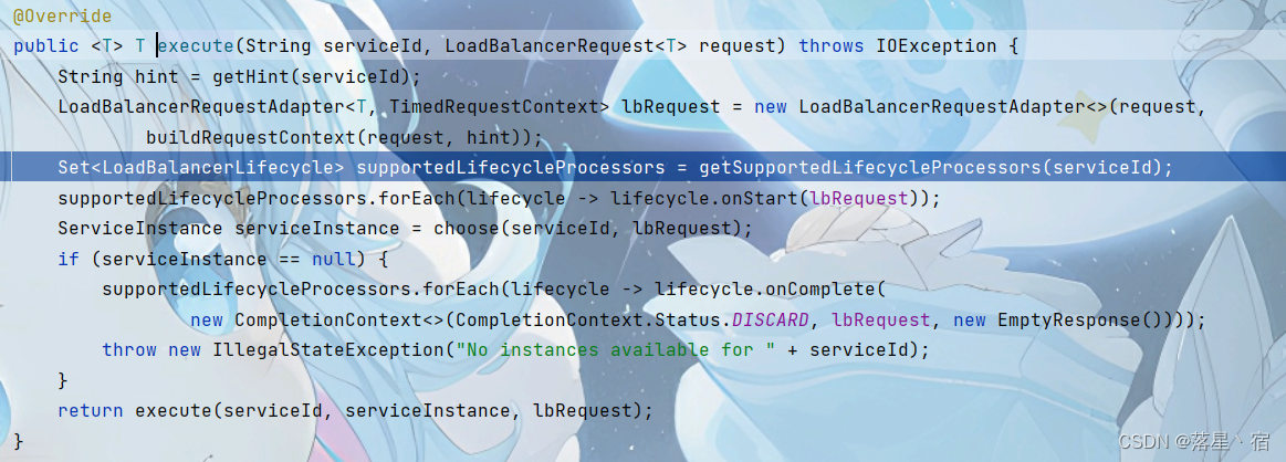 第二句则为:先是对supportedLifecycleProcessors集合中的每个生命周期处理器进行了迭代,再通过onStart方法处理lbRequest,其实现一部分初始化操作.而服务实例列表也存在lbRequest中.