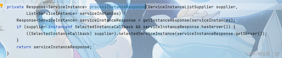 processInstanceResponse方法会对服务实例列表提供者做出一些判断,如果为SelectedInstanceCallback且通过getInstanceResponse获取到了服务实例,会将选定的服务实例传递给回调函数,不过这并不是我们重点,我们关注的重点是
