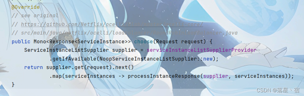 我并未指定服务实例列表提供者,故这个方法最终指向默认的服务实例列表提供者,即org.springframework.cloud.loadbalancer.annotation下LoadBalancerClientConfiguration类中ReactiveSupportConfiguration内部类下的discoveryClientServiceInstanceListSupplier方法(有点绕).这个流程可以简单理解为根据请求中的服务名,从ApplicationContext中获取对应的ServiceInstanceListSupplier实例.(PS:ServiceInstanceListSupplier的作用是根据服务名提供对应的服务实例列表)