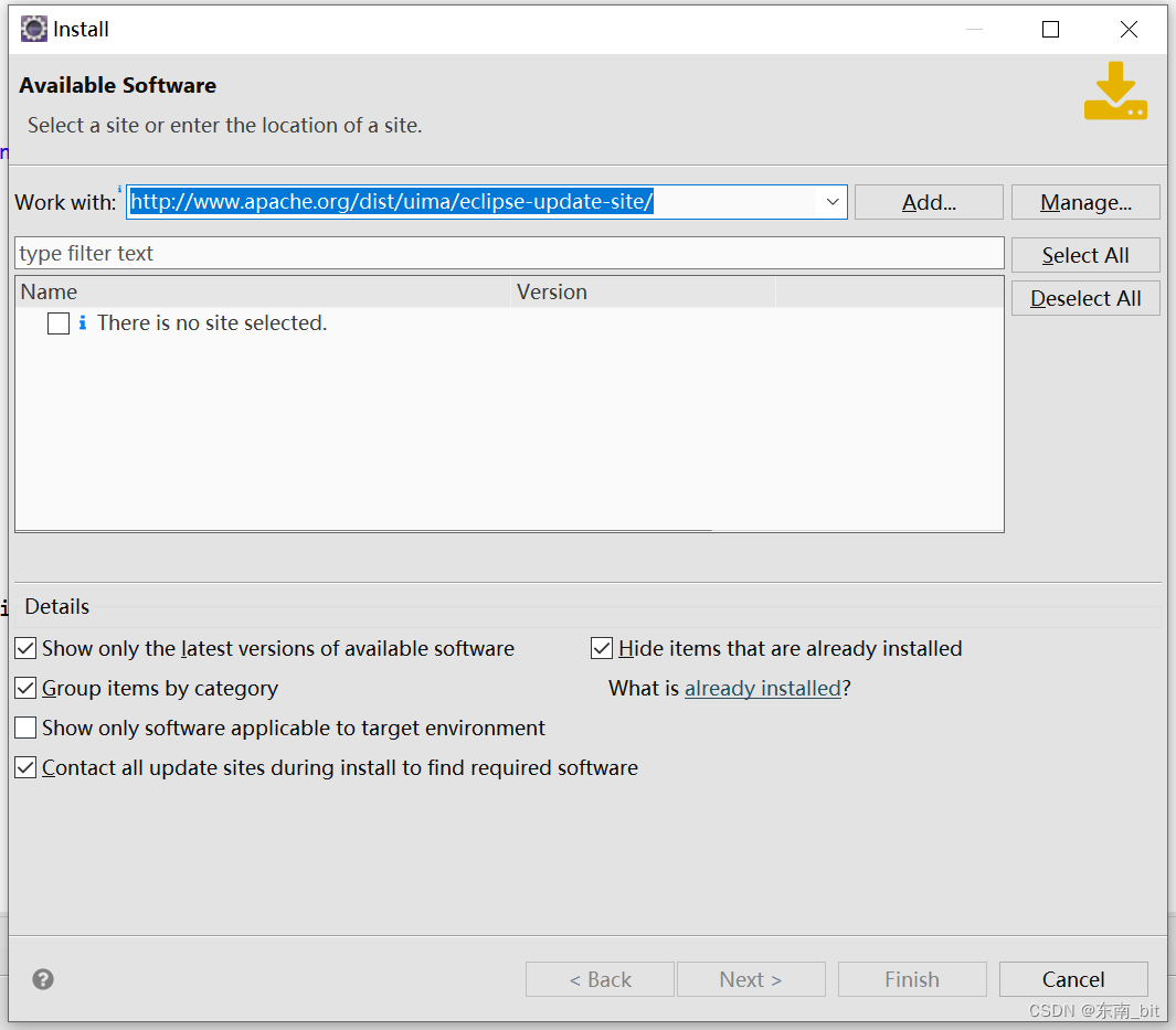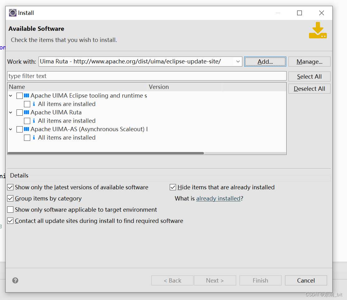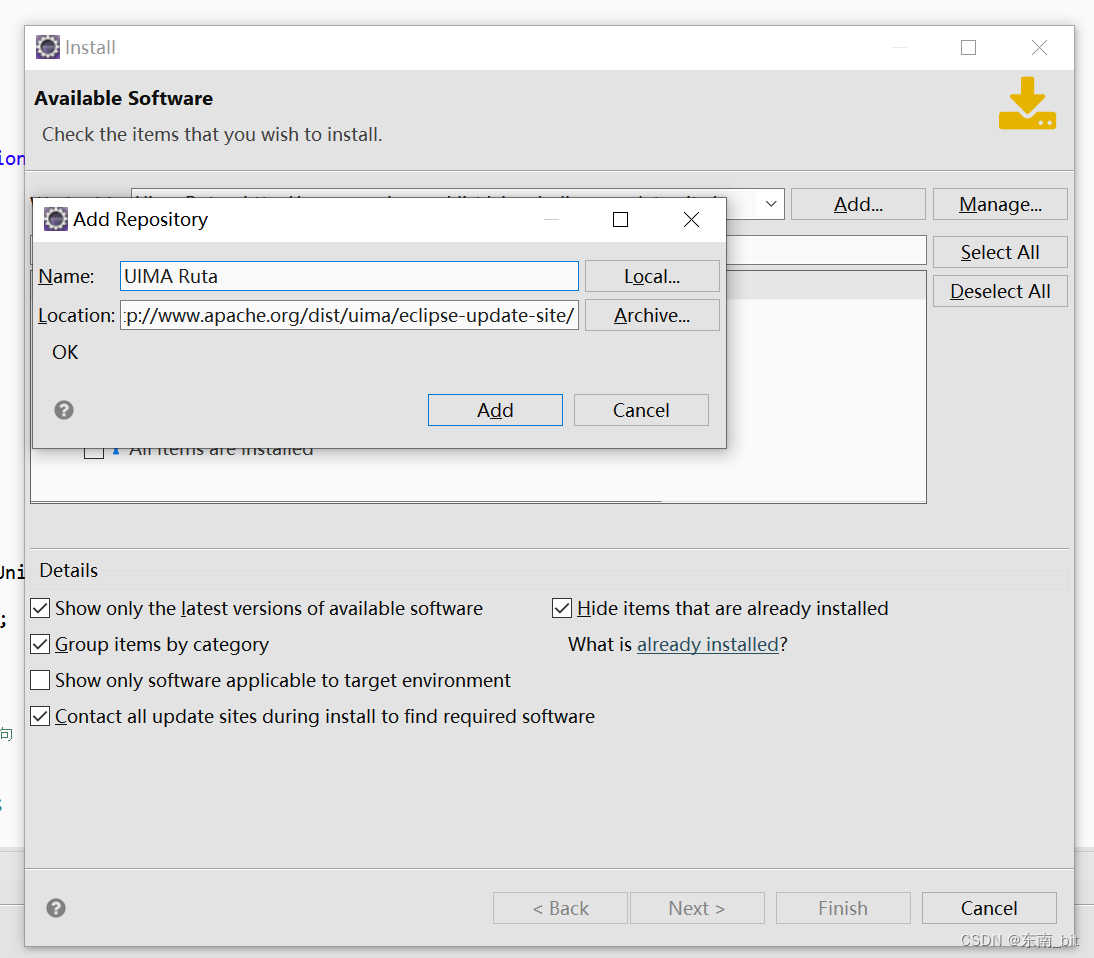 在Work with一栏中填入:“http://www.apache.org/dist/uima/eclipse-update-site/”,点击Add