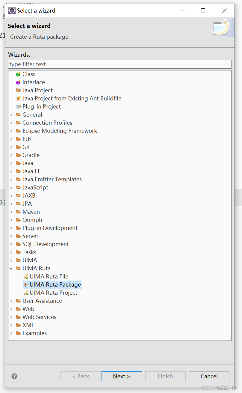 然后在script包上右键,选择UIMA Ruta Package(这一步虽然不是必须的,但就跟我们不会把java直接放入src目录下一样,这里的规则脚本其实就是我们要运行的代码,我们也用包管理起来),给包起个名字com.test