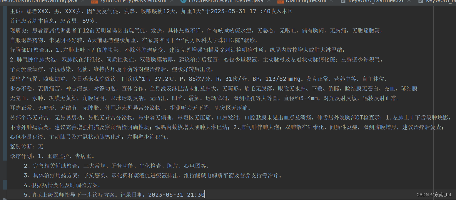 最近接到一个任务,需要对医院患者的门诊病历和住院患者的病程记录进行分析,根据其症状对其归类,比如同时出现发热和咳嗽的归类为发热伴呼吸道症候群,同时出现发热和咳血的归为发热伴出血症候群。比较麻烦的是,发热的表述不止一种,比如高烧、高热,体温高,热峰38.5度,都算发热,血痰血便也都算出血。如果出现发热2天这种表述的,需要根据就诊时间往前推两天作为其发病时间。而且如果熟悉病程记录的话,会知道病程记录经常会出现否定表述。