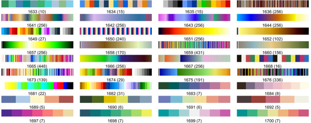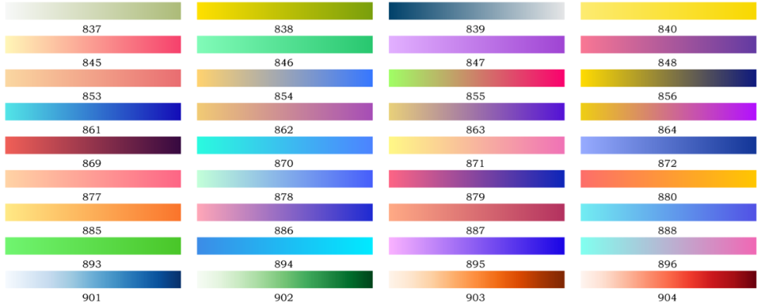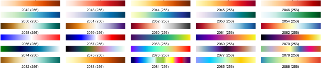 使用时,只需要对照速查表选择想要配色方案的序号(括号中数字为配色方案包含颜色的数量)作为输入参数,即可得到对应配色方案RGB矩阵: