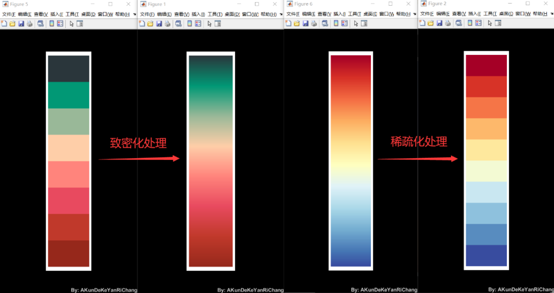 %% demo6-渐变色% 选择sci配色中的1号配色,致密化为包含256种颜色的渐变色C1 = TheColor('sci',1,'map',256,'seka',0);% 选择gradient中的923号渐变色,稀疏化为包含10种颜色的配色C2 = TheColor('gradient',923,'map',10,'seka',1);% 选择图片中颜色,致密化为包含256种颜色的渐变色C3 = TheColor('copy','map',256,'seka',0);