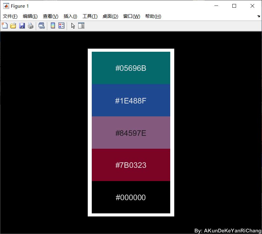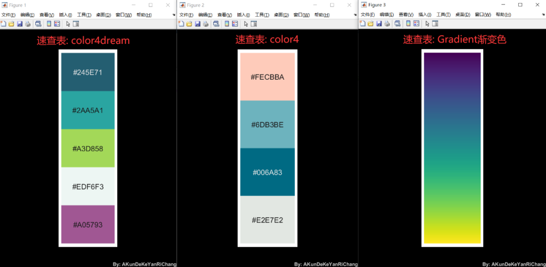 %% demo2-Dream配色使用% 选择1号配色C1 = TheColor('dream',1,'seka',1);%% demo3-Hunt配色使用% 选择788号配色C2 = TheColor('hunt',788,'seka',1);%% demo4-Gradient渐变配色使用% 选择929号渐变配色C3 = TheColor('gradient',929,'seka',0);