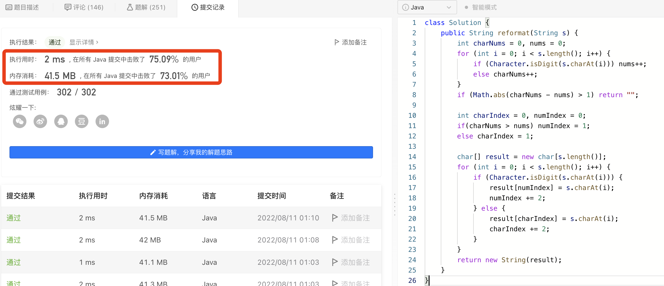 在4.1的处理逻辑中,我们发现还是比较麻烦的,并且代码量也不少,执行时间也比较慢。那么,还有什么更好的解题思路吗?肯定是有的。这里,我们不去将字母和数字存储到两个集合中了。我们借用奇数位和偶数位来将字母或者数字插入到新的char数组中。与上面解法不同,我们只需要计算出字母出现的个数charNums和数字出现的个数nums。如果字母个数更大,则字母插入到奇数位,数字插入到偶数位;如果数字的个数更大,则数字插入到奇数位,字母插入到偶数位。具体操作,如下图所示: