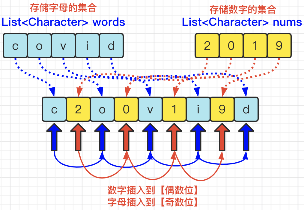 好了,通过上面的一些操作之后,words和nums需要拼装的部分长度就相同了(因为我们把多出的那一个字符保存到了lastChar里了)。通过循环遍历,将words和nums进行拼装,拼装方式就是——如果是字母个数较大,那么拼装顺序就是“字母”+“数字”;如果是数字个数较大,那么拼装顺序就是“数字”+“字母”;具体操作如下图所示: