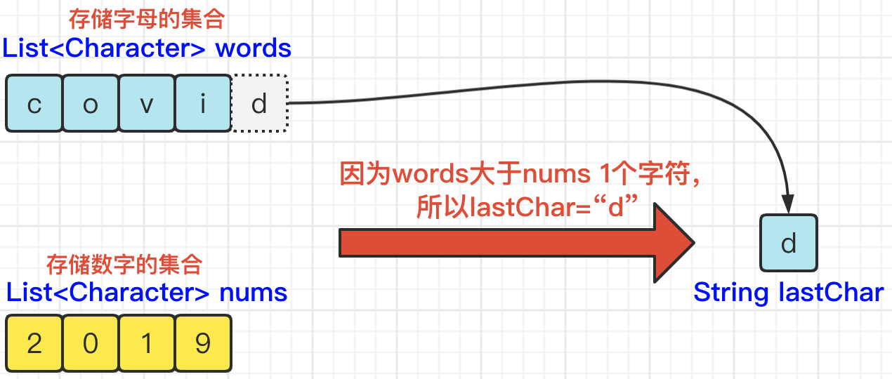 既然拆分出了字母集合和数字集合,那么我们就可以根据他们各自的size()来判断是否可以组成字母与数字相间的字符串。也就是说,当words和nums他们两者之间的长度差距大于1个字符,则无论怎么拼装,都不会满足题目要求的最终字符串了,那么这种情况,直接方法返回空的字符串——“”。那么,如果两者之间长度等于1,无论是字母集合多了一个字符,还是数字集合多了一个字符,我们都把那个多的集合的最后一个字符存储到lastChar变量中。当然,如果words和nums两者之间的长度相同,则lastChar就是默认值“”。具体操作如下图所示: