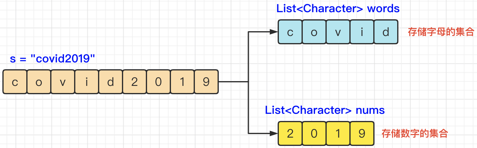 通过上面的分析,我们首要的第一个步骤就是拆分原有字符串,将所有字母都放到字母集合——words中;将所有数字都放到数字集合——nums中;我们以s=“covid2019”为例,下面是具体的拆分情况: