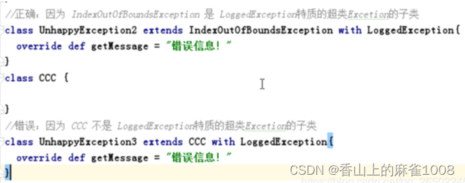 如果混入该特质的类,已经继承了另一个类(A类),则要求A类是特质超类的子类,否则就会出现了多继承现象,发生错误。