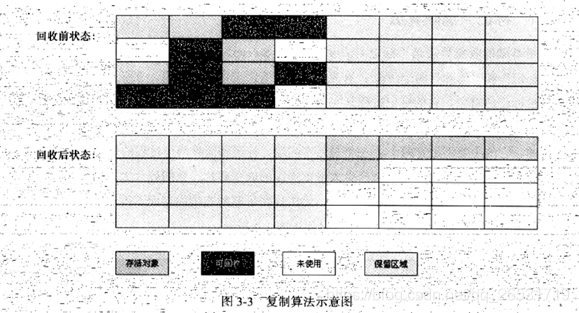为了解决标记清除的效率问题,出现了复制算法。它将可用的内存分为容量大小相等的两块,每次只使用其中的一块,当这一块用完时,就将还活着的对象复制到另一块上面,然后将已使用过的空间一次清理掉。