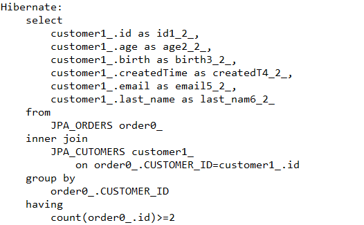 group by 子句用于对查询结果分组统计,通常需要使用聚合函数。常用的聚合函数主要有AVG、SUM、COUNT、MAX、MIN 等,它们的含义与SQL相同。例如:select max(o.id) from Orders o