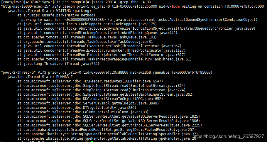 再使用jstack命令打印线程堆栈信息,命令格式:jstack pid |grep tid -A 30