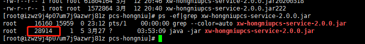 使用top -c和ps -ef|grep xw-......-service-2.0.0.jar命令查看资源占用情况,确定占用了大量CPU资源的进程。