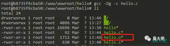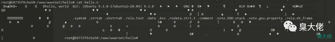 如果我们使用 “-C” 命令行选项,GCC会编译并汇编该代码:这就会产生目标代码文件hello.o, 它是二进制格式的,所以无法直接査看。
