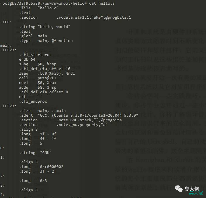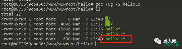 在命令行上使用“-S”选项,就能看到C语言编译器产生的汇编代码,这会使GCC运行编译器,产生一个汇编文件hello.s,但是不做其他进一步的工作。