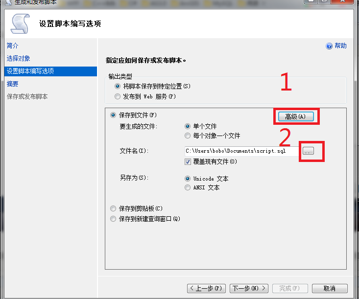 3 在当前页面下面第一步选择高级选项,然后再选择输出的sql脚本的保存位置。