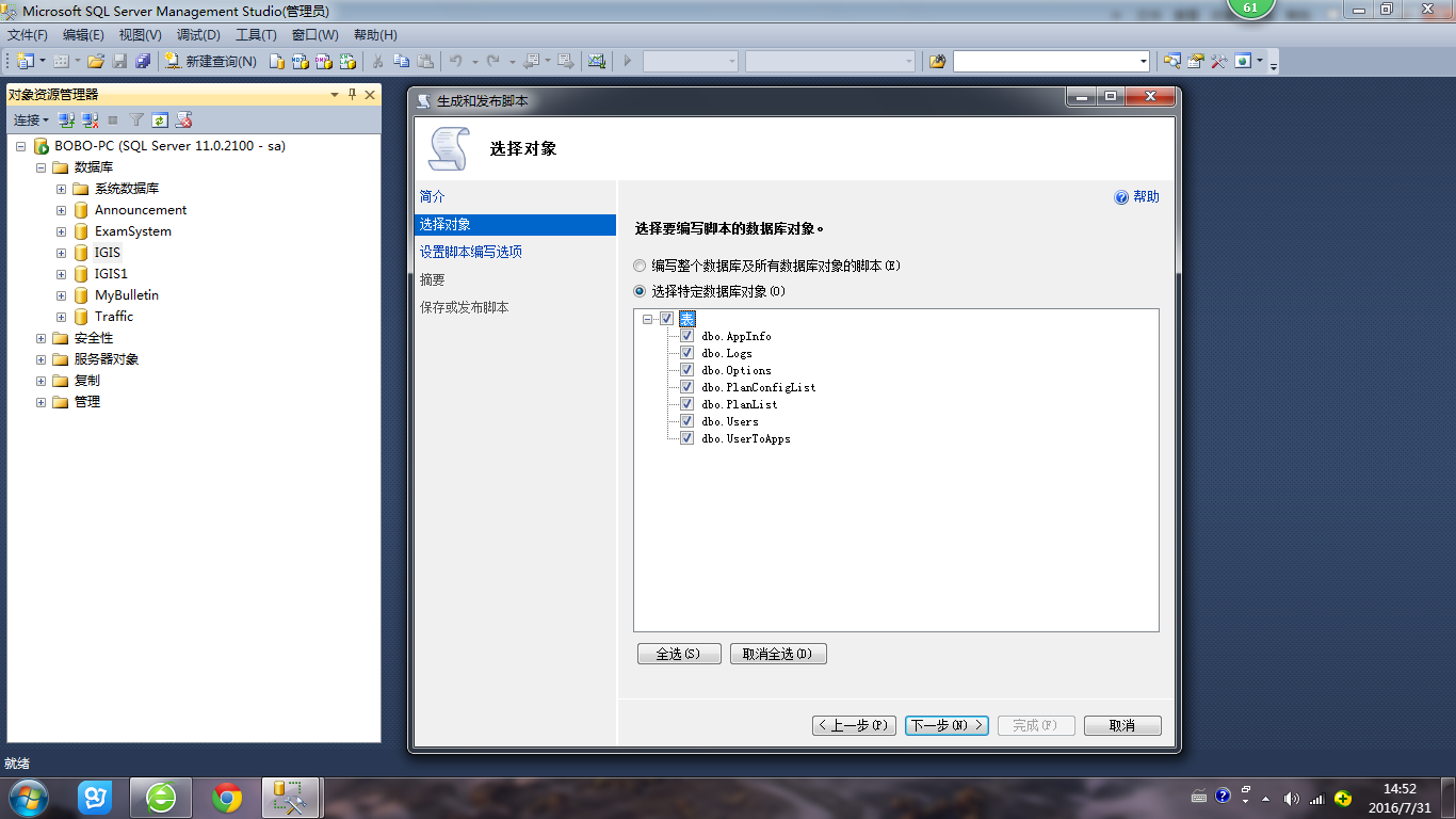 2 选择要编写脚本的数据库对象,注意此处可以选择特定的数据库对象,我们可以选择我们需要备份的数据表。