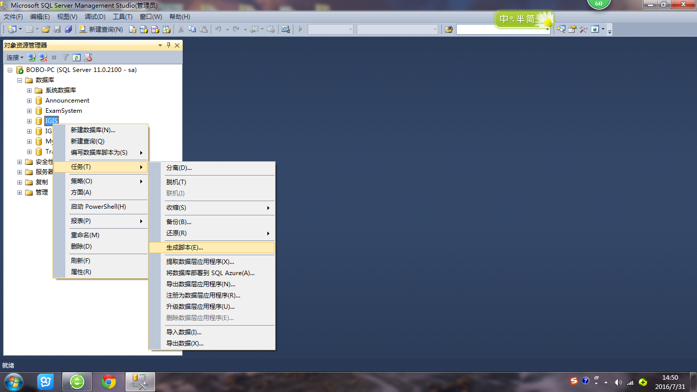 1 选择某一个数据库,右键依次选择:任务==》生成脚本;
