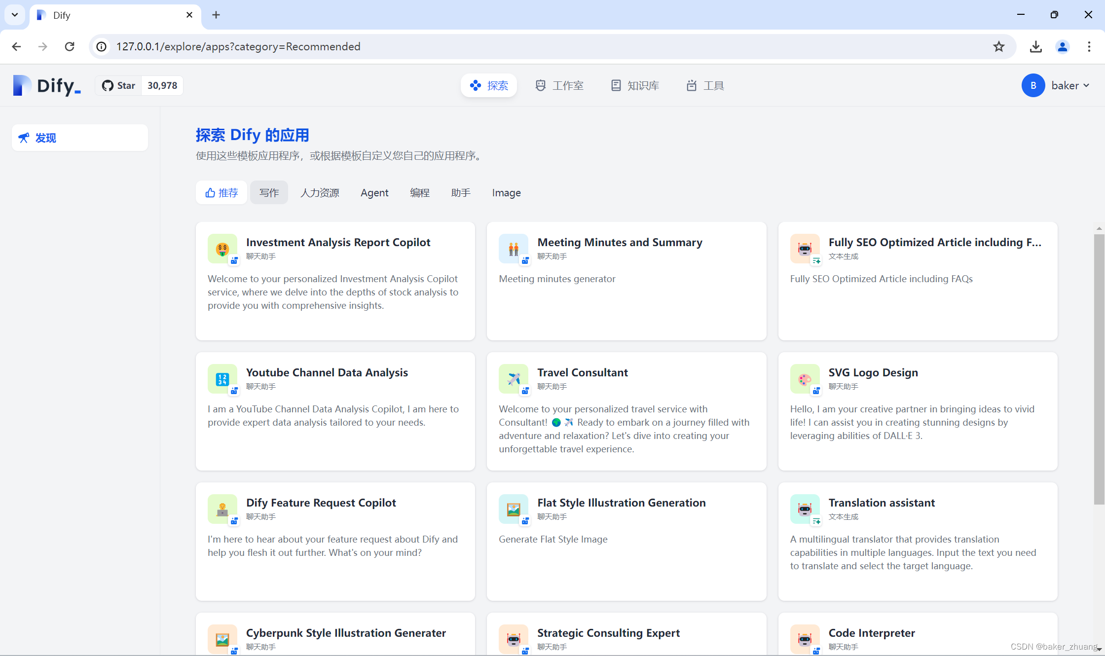 Dify分为探索,工作室,知识库和工具四个模块,探索模块中提供了一些已经实现的功能,可以作为入门学习。